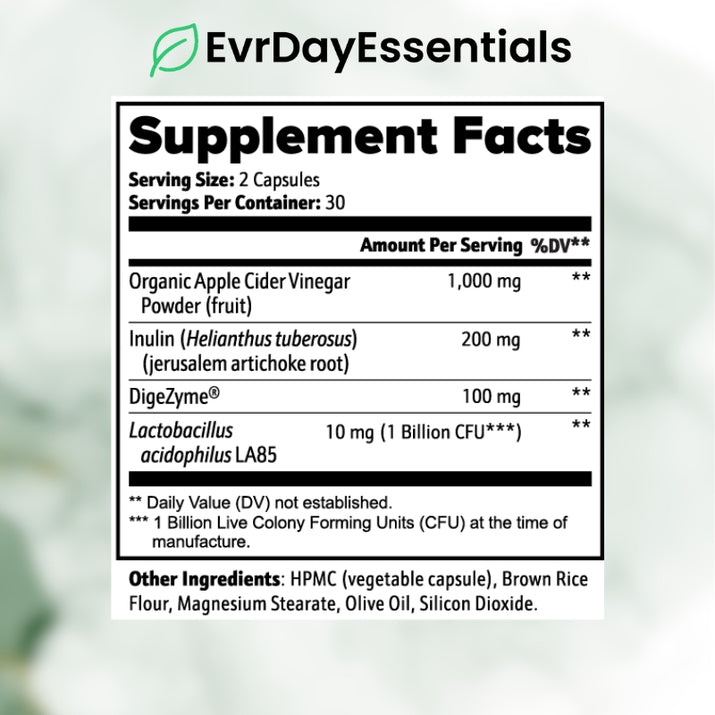 Answer 1: The supplement contains organic Apple Cider Vinegar Powder for digestion support, Inulin (a prebiotic fiber) from Jerusalem artichoke to feed healthy gut bacteria, Lactobacillus acidophilus for balancing gut flora, and a DigeZyme® Multi-Enzyme Complex for better nutrient absorption.